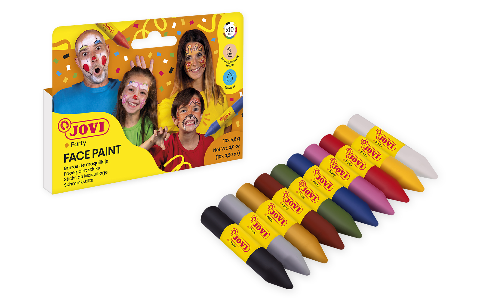 Bezpieczne, łagodne, łatwe w aplikacji kredki do ciała i twarzy, dobrze kryją i trzymają się, piękna kolorystyka, waga: 10 x 5,6g
