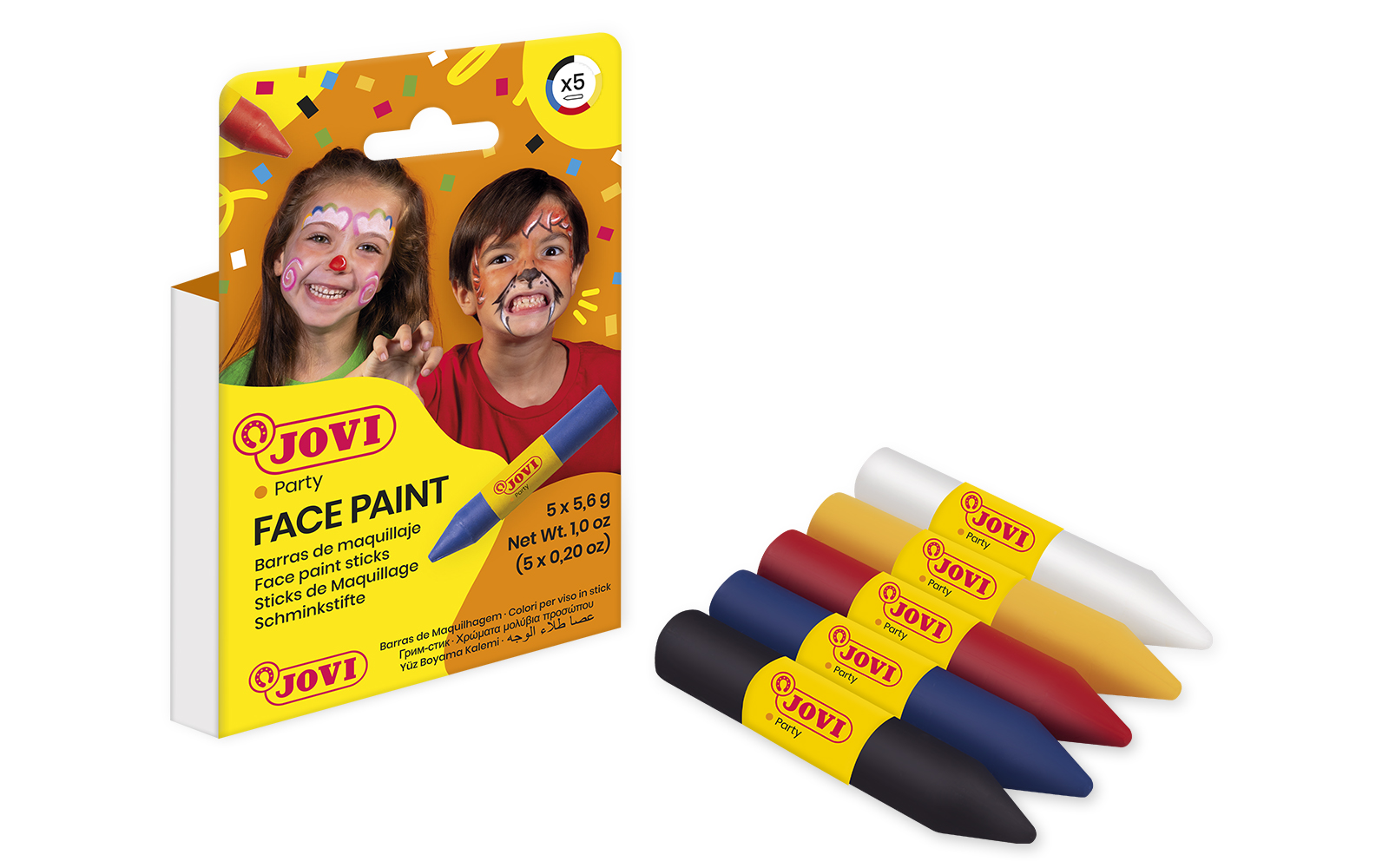 W skład zestawu wchodzi 5 małych, 3,5g kredek w kolorach: biały, żółty, czerwony, niebieski, czarny oraz praktyczne opakowanie idealne do przechowywania i przenoszenia kredek. Kredki hiszpańskiej firmy Jovi przeznaczone do malowania twarzy i ciała łatwo się rozprowadzają, trwale pokrywają skórę nawet w trakcie aktywnej zabawy i w łatwy sposób usuwają się nawilżonymi chusteczkami lub pod wpływem wody z mydłem lub mleczka kosmetycznego. Można je temperować. Kredki są bezpieczne, nietoksyczne, zawierają barwniki kosmetyczne łagodne dla skóry i posiadają atest PZH.