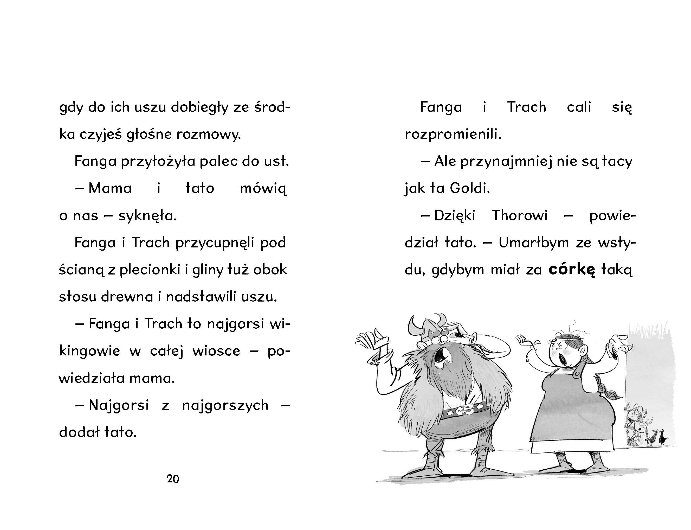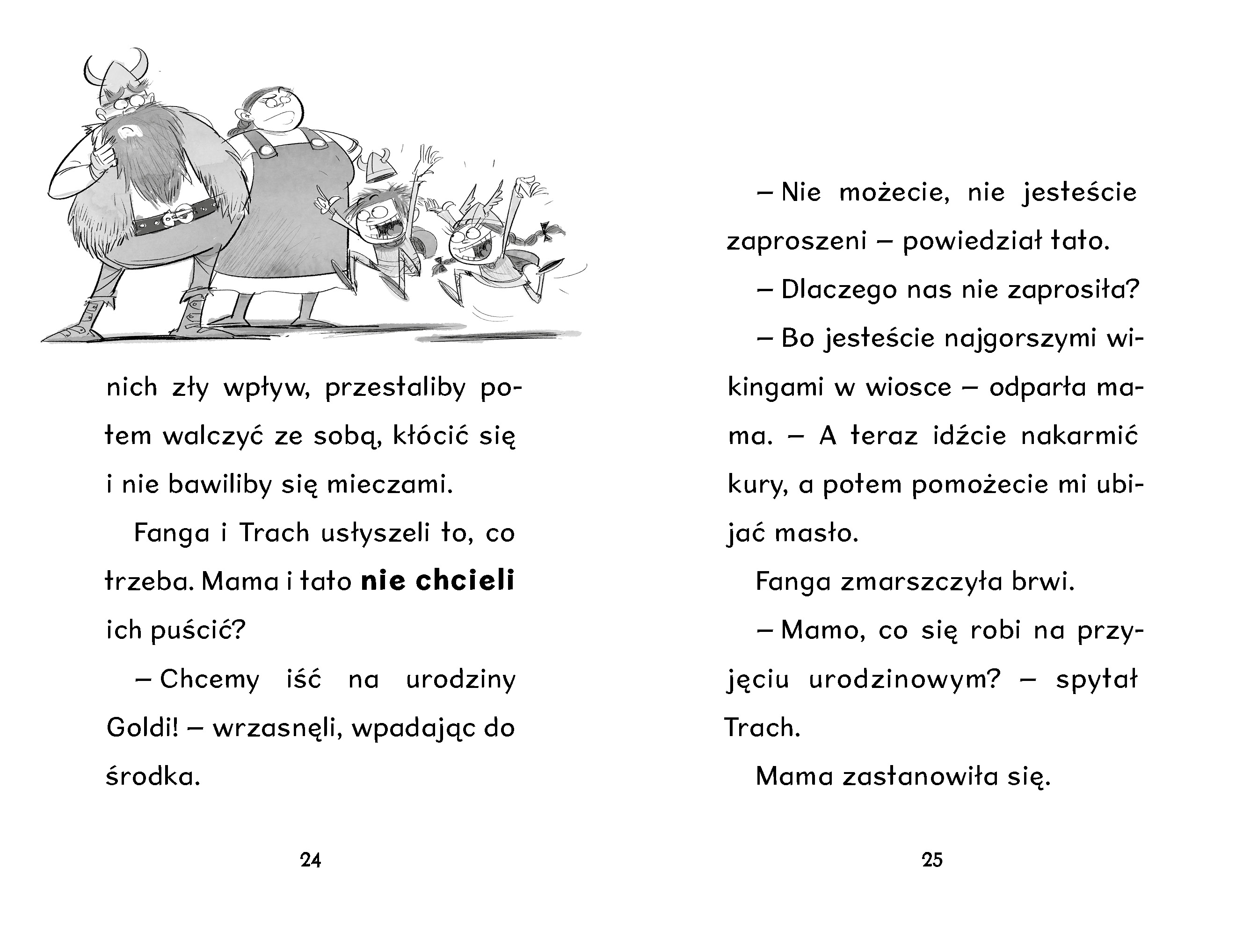 ,,Wikingowie-bliźniaki Fanga i Trach sprawiają, że jestem wdzięczny Thorowi, Odynowi i całemu nordyckiemu panteonowi, że nie muszę się z nimi bawić w rzeczywistości! To prawdziwa przyjemność dla dzieci, które zastanawiają się, co by się stało, gdyby złamały każdą istniejącą zasadę, a równocześnie jest tak zabawne, że zapomną spróbować, bo będą się tak mocno śmiały. Ilustracje Steve'a May tryskają dziką energią; szczerze się roześmiałam na jego rysunek gry w przypinanie ogona do kozła. Cudownie absurdalne, anarchiczne wybryki."" -- Sarah McIntyre
