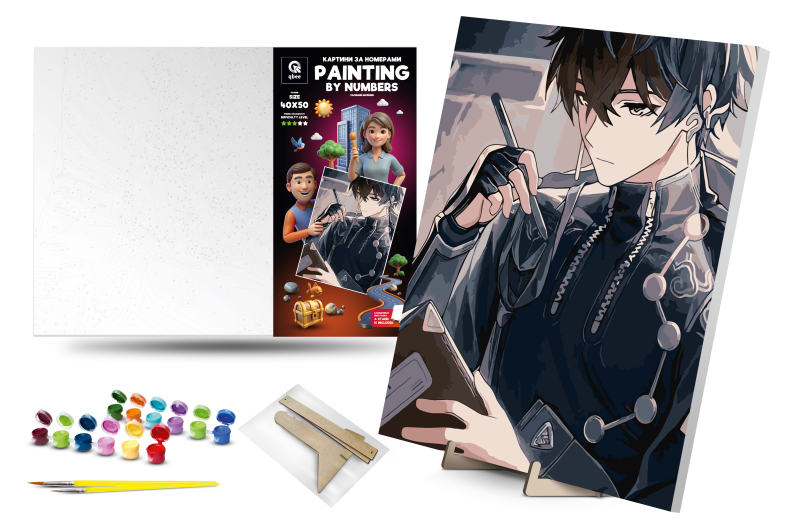 Zestaw do malowania numerycznego składa się z zagruntowanego płótna artystycznego na blejtramie, zestawu wysokiej jakości farb akrylowych odpornych na ścieranie i przypalanie o pojemności 2,5 ml 9% każda, nylonowych pędzli różnej wielkości, drewnianego stojaka oraz kartę kontrolną.