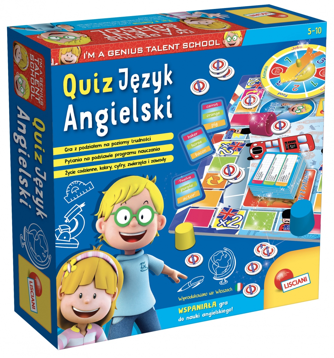Gra rozwijająca słownictwo i wiedzę z języka angielskiego. W grze odpowiadamy na pytania i przesuwamy swój pionek po planszy, zdobywając przy tym specjalne odznaki. Quiz z pytaniami został przygotowany na podstawie programu nauczania w szkole podstawowej i jest podzielony na trzy poziomy trudności. Opakowanie zawiera instrukcję.
