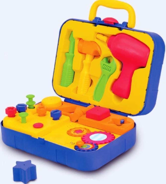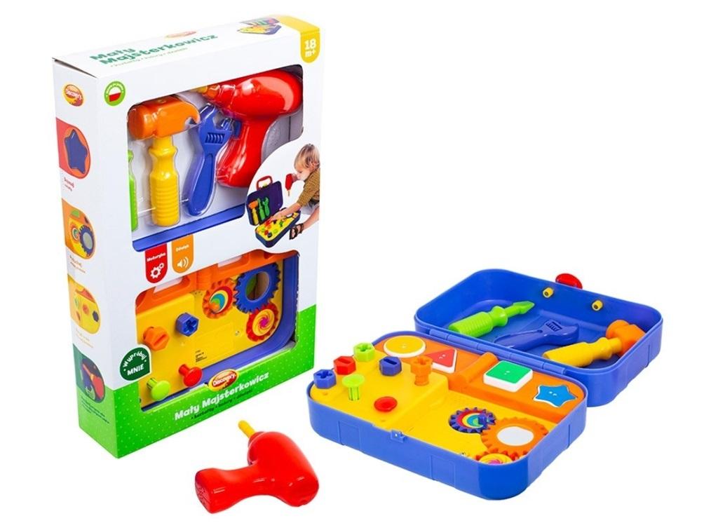 Zestaw składa się z 4 narzędzi: wiertarka,młotek, śrubokręt i klucz francuski orazkolorowych klocków. Po odgadnięciu ichprawidłowego kształtu i dopasowaniuw odpowiednim miejscu zabawka nagrodziDziecko zabawnymi dźwiękami. Dodatkowowbijanie gwoździ i wkręcanie kolorowychśrubek urozmaicone dźwiękami sprawiDzieciom wiele radości. Wprowadź trybikiw ruch żeby usłyszeć wesołe melodie. Walizkama idealny kształt wielkość, a wygodny uchwytpozwala na przenoszenie skrzynki w różnemiejsca.