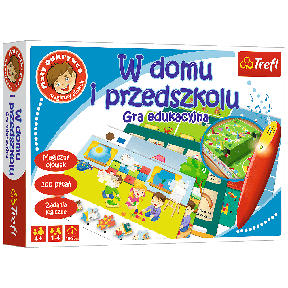 Dom i przedszkole to świat Małych Odkrywców. Poznajmy go wspólnie bliżej! Gra rozbudzi w dzieciach ciekawość poznawczą i zachęci do eksplorowania najbliższego otoczenia. Czy wiesz, jakie rzeczy znajdują się w różnych pomieszczeniach w domu? Znasz smakołyki, które możemy znaleźć w kuchni? Czy wiesz, ile w przedszkolu jest zabawek i co znajdziemy na placu zabaw?