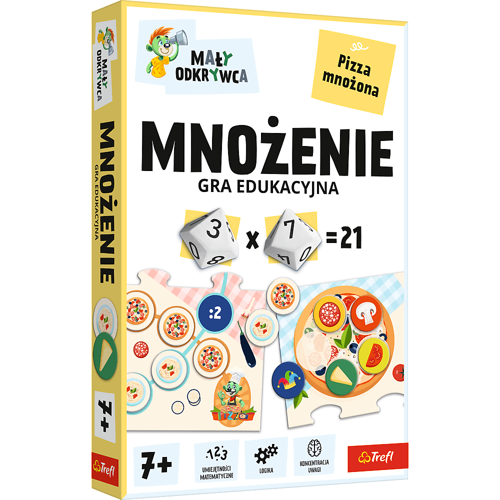 Układanka edukacyjna Mnożenie, która w prosty i przyjemny sposób wprowadza maluchy w świat mnożenia do 100! Dzięki wprowadzeniu mechaniki współzawodnictwa przy komponowaniu własnej pizzy i wyścigu kucharzy, dziecko rozwija nie tylko koncentrację uwagi i spostrzegawczość, ale także kształtują się jego kompetencje społeczne i emocjonalne. Zawartość: 2 kostki dziesięciościenne dwustronna plansza 26 żetonów instrukcja z wieloma propozycjami zabaw Wiek 7+