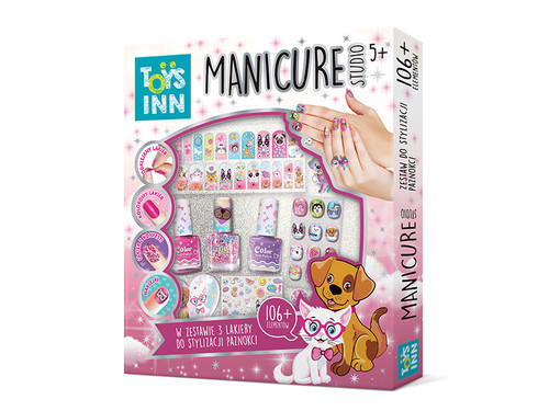 W zestawie: 3 lakiery do paznokci, 12 tipsów, 20 naklejek na paznokcie, 1 arkusz kolorowych naklejek, 2 pilniczki, pierścionek