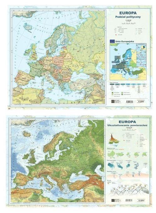 Dwustronna mapa ścienna Europy oprawiona w rurki PCV i sznuerk. Obustronnie laminowana, zawiera mapę Europy z podziałem politycznym oraz mapę ukształtowania terenu Europy. Można po niej pisać pisakiem suchościeralnym.