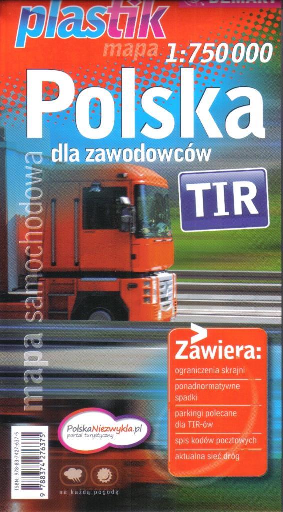 Mapa przeznaczona jest nie tylko dla kierowców zawodowych (TIR-ów,   ciężarówek,) ale i dla wszystkich innych kierowców, którzy dużo jeżdżą po   Polsce.Ma rozbudowaną treść tematyczną przydatną kierowcom   zawodowym:- ponadnormatywne spadki z opisem stopnia nachylenia,- pionowe   i poziome ograniczenia skrajni,- polecane parkingi (TIR, prysznic,   gastronomia),- czarne punkty,- utrudnienia w ruchu pojazdów na drogach   krajowych (miejsca tworzenia się korków),- prawdopodobna lokalizacja   fotoradarów.Podobnie jak mapa samochodowa Polski w wersji podstawowej   charakteryzuje się aktualną i szczegółową siecią dróg.