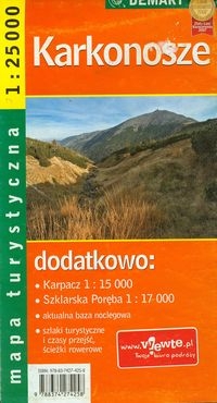 Dwustronna mapa turystyczna Karkonoszy zawiera wiele informacji przydatnych turystom pieszym i rowerzystom planujących górskie wycieczki, m.in. szlaki turystyczne wraz z czasem przejścia, ścieżki dydaktyczne, trasy rowerowe. Lokalizacja wyciągów narciarskich, nartostrad i tras zjazdowych stanowi niezbędną informację dla miłośników białego szaleństwa. Plany Karpacza (1:15 000) i Szklarskiej Poręby (1:17 000 ) wraz ze spisem ulic i aktualną bazą noclegową to kolejne atuty tej mapy. Szczegółowy rysunek skał i cieniowanie oddają bardzo plastycznie rzeźbę terenu tego pięknego regionu.