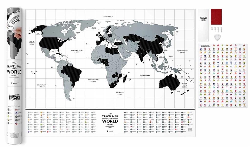 Czarna mapa świata umieszczona jest na białym tle. Wystarczy za pomocą dołączonej do zestawu kostki usunąć srebrną powłokę z danego kraju, aby stworzyć całą historię swoich podróży. Dodatkowo w zestawie znajdziesz zestaw naklejek z flagami narodowymi, dzięki którym możesz zaplanować kolejne destynacje.