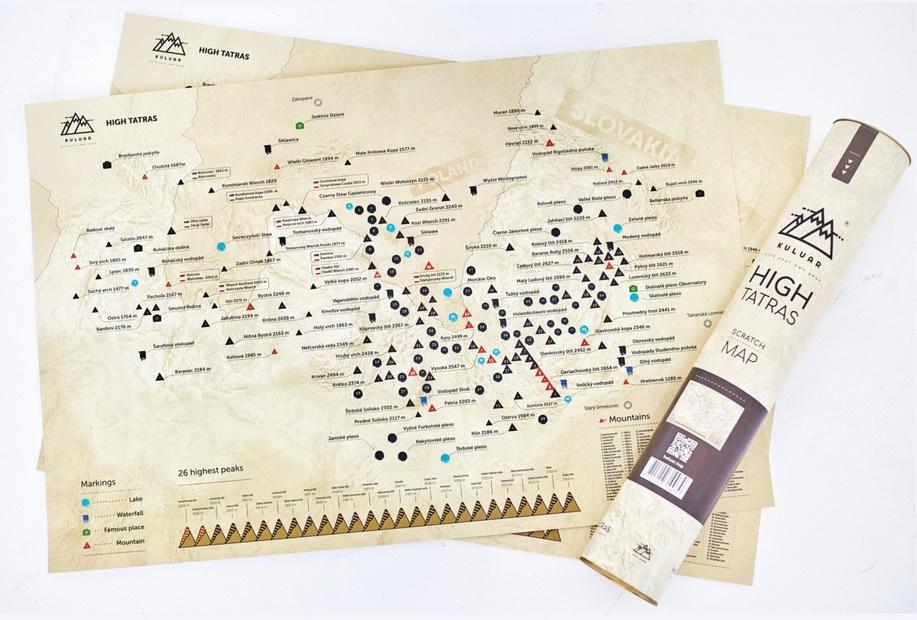Mapa do zdrapywania Mountain Peaks High Tatras wykonana jest z wysokiej jakości plastiku z możliwością pisania na niej mazakiem ścieralnym oraz zdrapywania miejsc już odwiedzonych.
