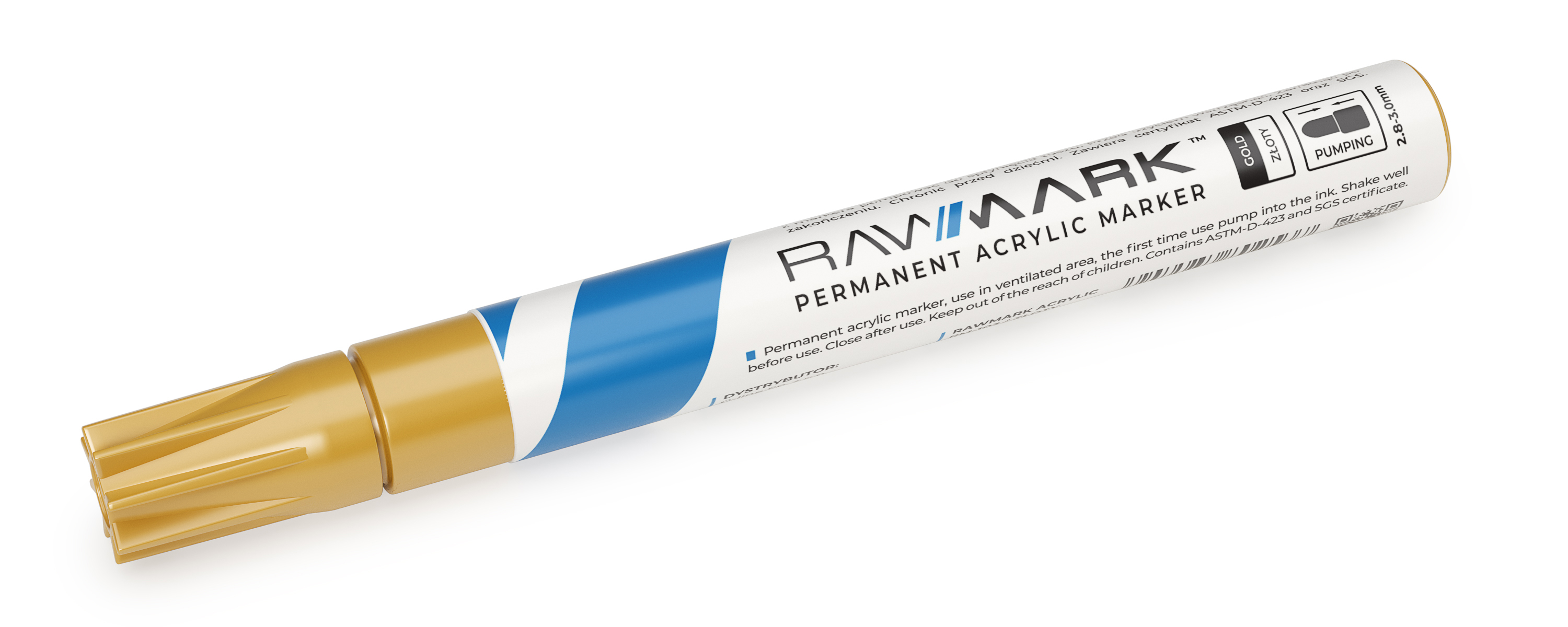Permanentny Marker olejowy RAWMARK RM-103 Wodoodporny i szybkoschnący tusz na bazie alkoholi. Bez problemu możemy nim pisać po powierzchniach ze stali, gumy, szkła, drewna, plastiku itp. Idealny również do zastosowań warsztatowych (może służyć do opisywania części, opon w zakładach wulkanizacji, etc.). Cechy: Przeznaczony do stali, gumy, drewna, plastiku, szkła i innych powierzchni Dobrze kryjący, trwały, niezmywalny wodą, nieblaknący, odporny na różne warunki atmosferyczne (woda, promienie UV) Końcówka fibrowa Okrągła końcówka 2,8 mm Marker olejny (lakierowy) posiada pompkę do tuszu, którą, przed pierwszym użyciem, należy pompować, aż spłynie tusz, (po wcześniejszym mocnym wstrząśnięciu markera) Kolor tuszu: złoty Szczelna zatyczka daje gwarancję długiej daty przydatności (po długim nieużywaniu zaleca się mocno wstrząsnąć).