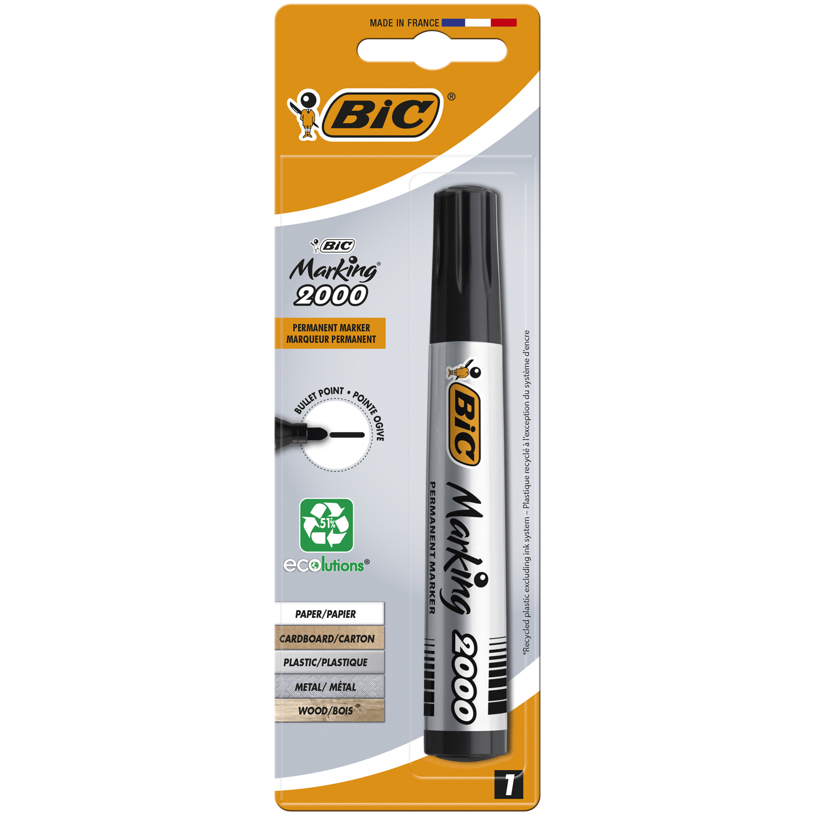 Tusz permanentny na bazie alkoholu. Plastikowy korpus. Neutralny zapach. Nie wysycha przez 3 tygodnie bez skuwki. Akrylowa blokowana końcówka. Okrągła końcówka. Szerokość linii pisania 1,7 mm. Długość linii pisania do 1400 m. Średnica końcówki 5,5 mm. Do stosowania na większości powierzchni: papier, karton, szkło, plastik, metal. Produkt bezpieczny - nie zawiera toksyn i metali ciężkich. Produkt nie zawiera PVC - polichlorku winylu.