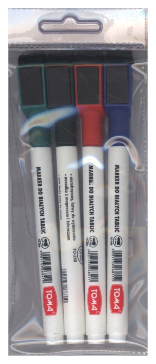 Marker do pisania po tablicach suchościeralnych, łatwościeralny tusz proszkowy na bazie alkoholu, zapach neutralny. Nasadka z magnesem i ścieraczem.