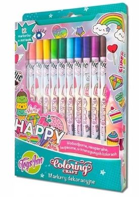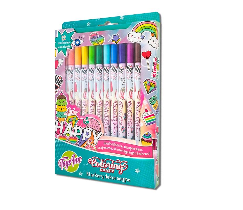 Pobudź swoją wyobraźnię i dekoruj! Zestaw 12 dekoracyjnych markerów. Wodoodporne, szybkoschnące, bezpieczne i trwałe. Intensywne kolory pozwalają na tworzenie wspaniałych, wyrazistych malunków. Kolory można również łączyć ze sobą uzyskując wiele nowych barw. Wykorzystaj je do kolorowania tekstyliów, przedmiotów skórzanych i rysowania na papierze.