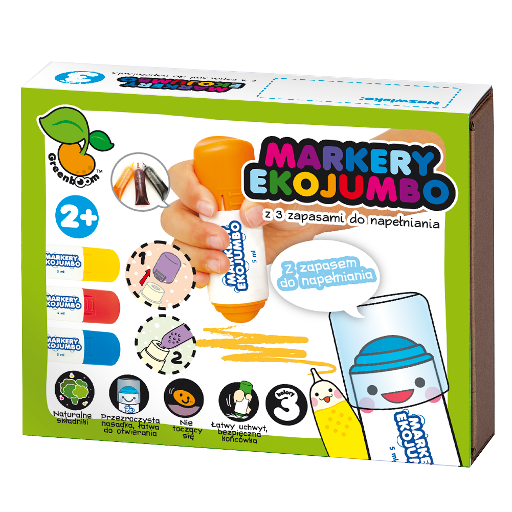 Zestaw 3-ech kolorowych markerów dla najmłodszych. Ucz dziecko od najmłodszych lat jak malować. Wykonane ze składników naturalnych są bezpieczne dla dzieci. Są w 100% zmywalne. Korpus MARKERA ECOJUMBO łatwo można uchwycić, jest zaprojektowany tak aby idealnie pasował do ręki dzieckaJeżeli marker zacznie się wypisywać skorzystaj z dodatkowych wkładów które są załączone w zestawie.