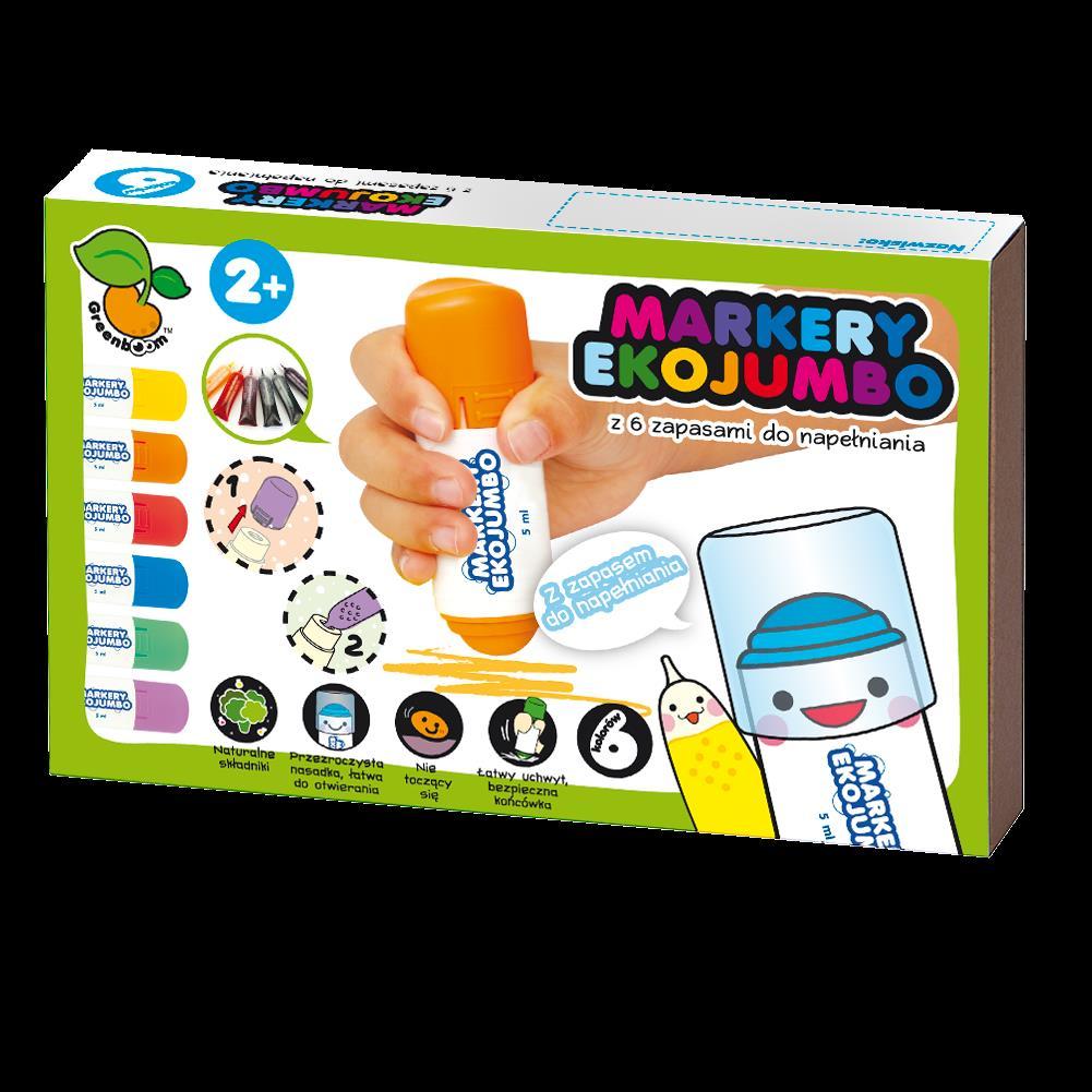 Zestaw 6-ciu kolorowych markerów dla najmłodszych. Ucz dziecko od najmłodszych lat jak malować. Wykonane ze składników naturalnych są bezpieczne dla dzieci. Są w 100% zmywalne. Korpus MARKERA ECOJUMBO łatwo można uchwycić, jest zaprojektowany tak aby idealnie pasował do ręki dzieckaJeżeli marker zacznie się wypisywać skorzystaj z dodatkowych wkładów które są załączone w zestawie.