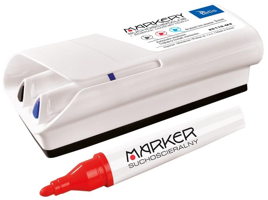 Komplet 3 markerów suchościeralnych (czarny, czerwony, niebieski) ze ścierakiem magnetycznym. Trójkątny kształt markerów. Końcówka stożkowa. Grubość linii pisania 3mm. Jednostka sprzedaży - 1 komplet (3 markery i ścierak).