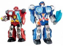 Napędzany, chodzący robot z migającymi światełkami i odłączanym uzbrojeniem.