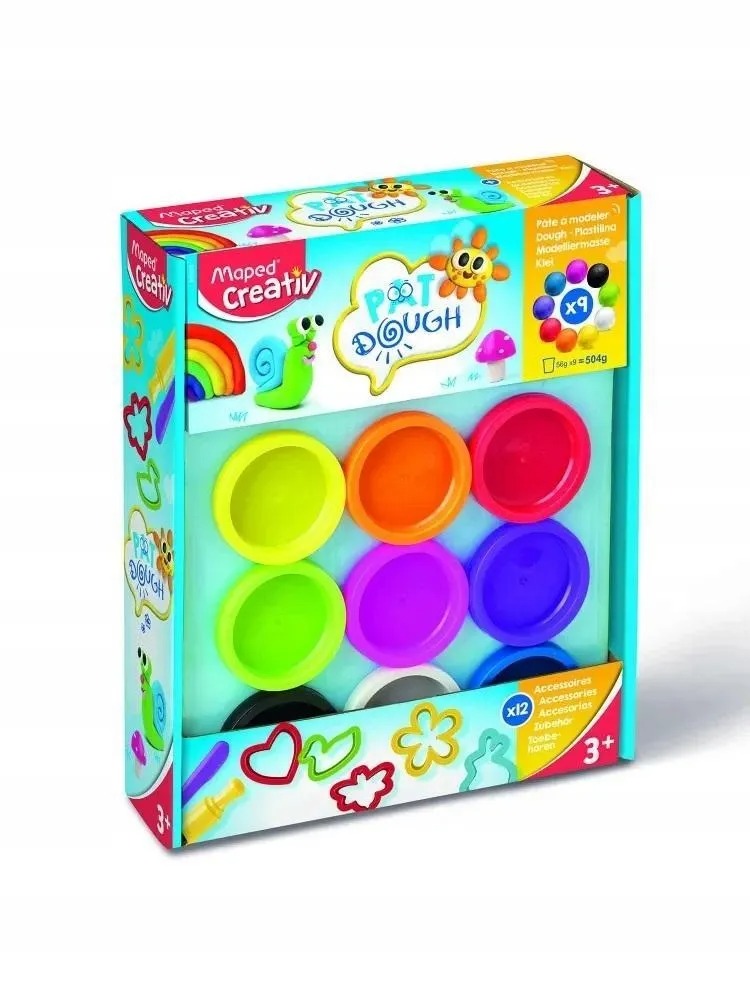 Miękka, nieklejąca się masa plastyczna w 9 kolorach: biały, żółty, czarny, pomarańczowy, różowy, czerwony, zielony i fioletowy. W zestawie akcesoria uatrakcyjniające zabawę: wałek, nożyk, 2 wyciskarki, 8 kształtów do odciskania. Praca z masą rozwija zdolności manualne dzieci. Ćwiczenie mięśni małych rączek jest ważnym etapem przygotowującym najmłodszych do nauki pisania. Transparentne pojemniki o pojemności 56 g umożliwiają podgląd zawartości bez otwierania.