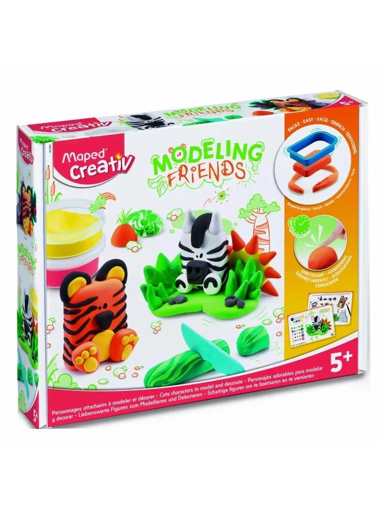 Kreatywny zestaw do tworzenia figurek z masy plastycznej twardniejącej na powietrzu przy pomocy dołączonych drobnych narzędzi. Dwa słodkie zwierzaki: tygrysek i zebra czekają, aż ktoś nada im właściwe kształty, przyozdobi i stworzy miłe i kolorowe otoczenie.