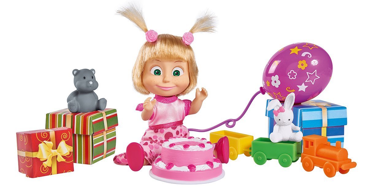Masha z wieloma akcesoriami potrzebnymi do urządzenia przyjęcia urodzinowego