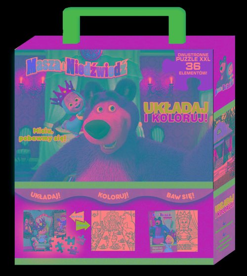 Oto pudełko pełne zabawy! Wewnątrz znajdziesz książeczkę z malowankami oraz dwustronne puzzle. Ułóż obrazek z Maszą i Niedźwiedziem, a potem odwróć układankę i pokoloruj scenkę według własnego pomysłu.