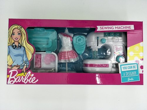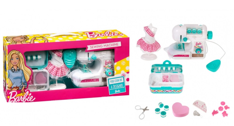 W zestawie: Szpulki na nici, Napęd – myszka, Koraliki w różnych kształtach, Poduszka na igły w kształcie serca, Organizer na akcesoria, Guziki, Manekin, Metr krawiecki, Nożyczki, Materiał: plastik, tkanina, metal, Maszyna do szycia zasilana na baterie (nie załączono),