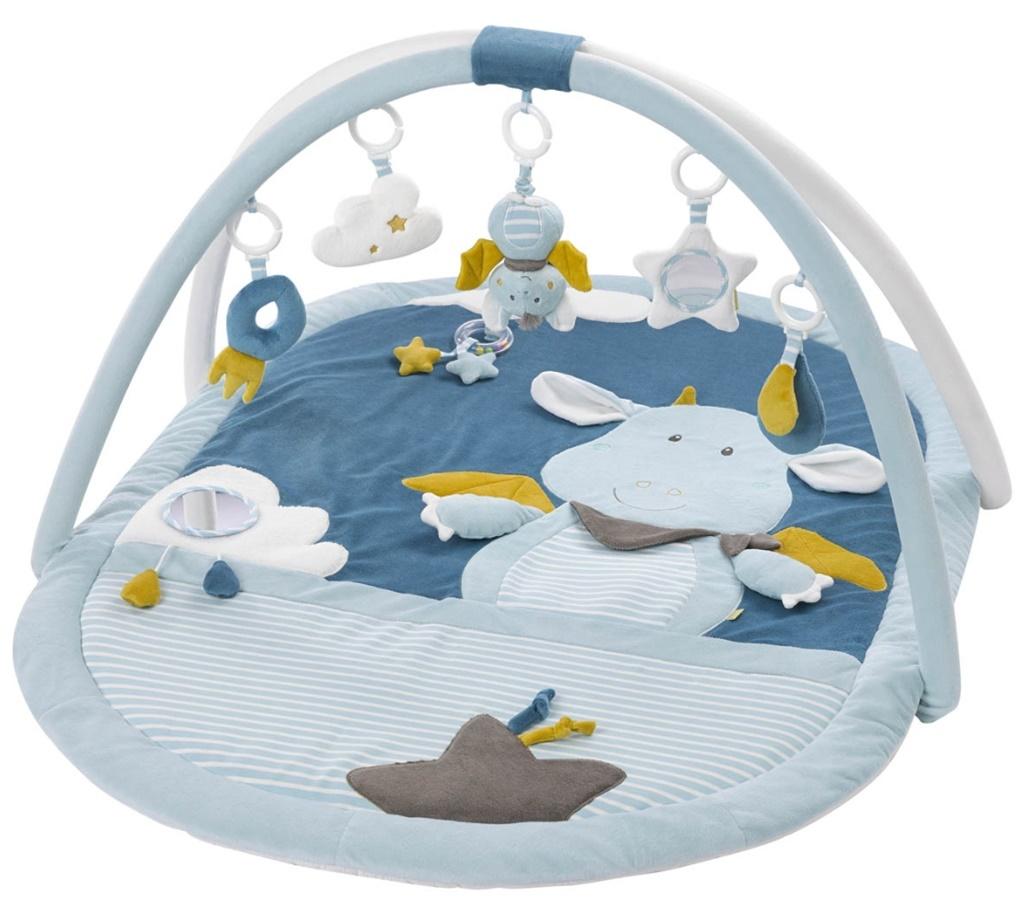 Mata edukacyjna z kolekcji: Mały Zamek. To idealny pierwszy plac zabaw dla maluchów. Wraz z wibrującym nietoperzem, grzechoczącą błękitną rakietą, pierzastą chmurką, która pod paluszkami dziecka wydaje delikatny szelest, dwiema zawieszkami, z których jedna wydaje dźwięk i bezpiecznym lusterkiem do przeglądania, twoje dziecko wyrusza na wielkie przygody i ekscytujące wyprawy do krainy snów. Trójwymiarowa mata aktywacyjna może być używana jako płaski plac zabaw lub jako przytulne gniazdko. Miękkie materiały zapewniają bezpieczeństwo i optymalny komfort dziecka od samego początku. Duże lusterko jest absolutną atrakcją maty. Więc twoje dziecko nieświadomie obserwuje relacje między przyczyną i skutkiem. Urocze zabawki zawieszone na łukach są łatwo dostępne. Pomagają wyszkolić zmysł dotyku dziecka i koordynację pierwszego kontaktu ręka-oko. Pięć małych zabawek można łatwo wyjąć, bawić się nimi osobno lub przymocować w wielu miejscach, dzięki czemu zapewniają one rozrywkę w domu i w podróży. Miękki i wygodnie wyściełany kocyk oferuje wiele funkcji: głowa smoka może pełnić rolę poduszeczki, łapki i uszka służą do pociągania i tarmoszenia. Tekstury i powierzchnie zachęcają do dotknięcia, przytulania i zabawy. Urocze detale chcą być badane przez twoje dziecko. Łuki są łatwe do zdemontowania, dzięki czemu dziecko może używać maty do zabawy, leżenia, raczkowania lub siedzenia, aż w końcu do zasypiania. Odpinane pluszowe, miękkie zabawki. Bezpieczne lusterko. Piszczałka, grzechotka, wibracje i szeleszczące elementy pomagają stymulować dotyk i słuch. Zachęca do zabawy oraz ćwiczeń wzmacniających mięśnie. Stymuluje i wspomaga rozwój poznawczy i umiejętności motoryczne. Łatwa w montażu. Wszystkie zabawki niemieckiej marki FEHN są bezpieczne dla dzieci od 0 lat. Wykonane są z najlepszej jakości materiałów. Spełniają normy EN71, CE, badane w instytutach ""Stiftung Warentest"" lub ""kotest.