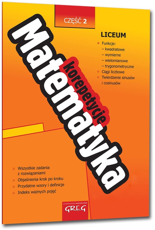 Seria Matematyka - korepetycje zawiera 3 części, w których omówione zostały poszczególne zagadnienia z programu zreformowanego liceum. Książki zawierają zarówno wiedzę teoretyczną: reguły, prawa, wzory, twierdzenia, definicje, jak i liczne zadania. Autorzy serii zamieścili w swoich częściach zarówno zadania proste, standardowe, jak i te, z którymi uczniowie najczęściej mają kłopoty. Wyjątkowość tej serii polega na tym, iż każde zadanie posiada pełne rozwiązanie wraz z pełnym opisem każdego działania. Z tymi książkami poczujesz się pewnie na każdej lekcji matematyki!