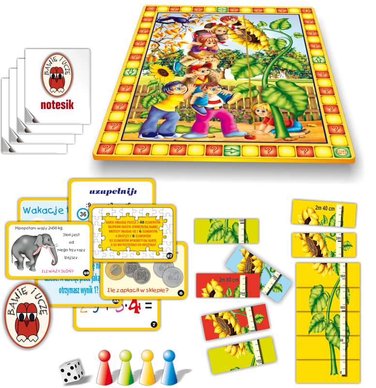 Ciekawa forma gry pomaga dziecku rozwiązać pierwsze matematyczne problemy. Zestaw składa się między innymi z kolorowej planszy, 50-u kart z pytaniami i zadaniami z zakresu od II do V klasy szkoły podstawowej.