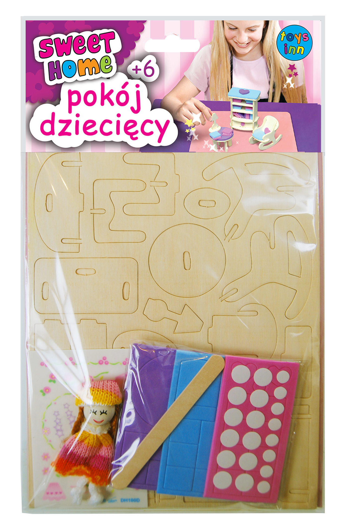 Mebelki drewniane dla dzieci. Zestaw zawiera drewniane elementy z których złożysz zestaw mebli do pokoju dziecięcego. Dodatkowo w zestawie: piankowe elementy do klejenia ,szpatułka oraz laleczka drewniana.