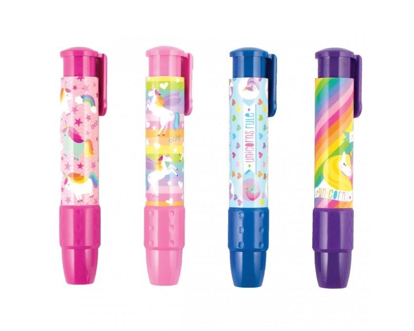 Mechaniczne Gumki do Ścierania Jednorożce są dostępne w 4 stylach i kolorach. Tuba display zawiera 24 gumki, 6 z każdego koloru.