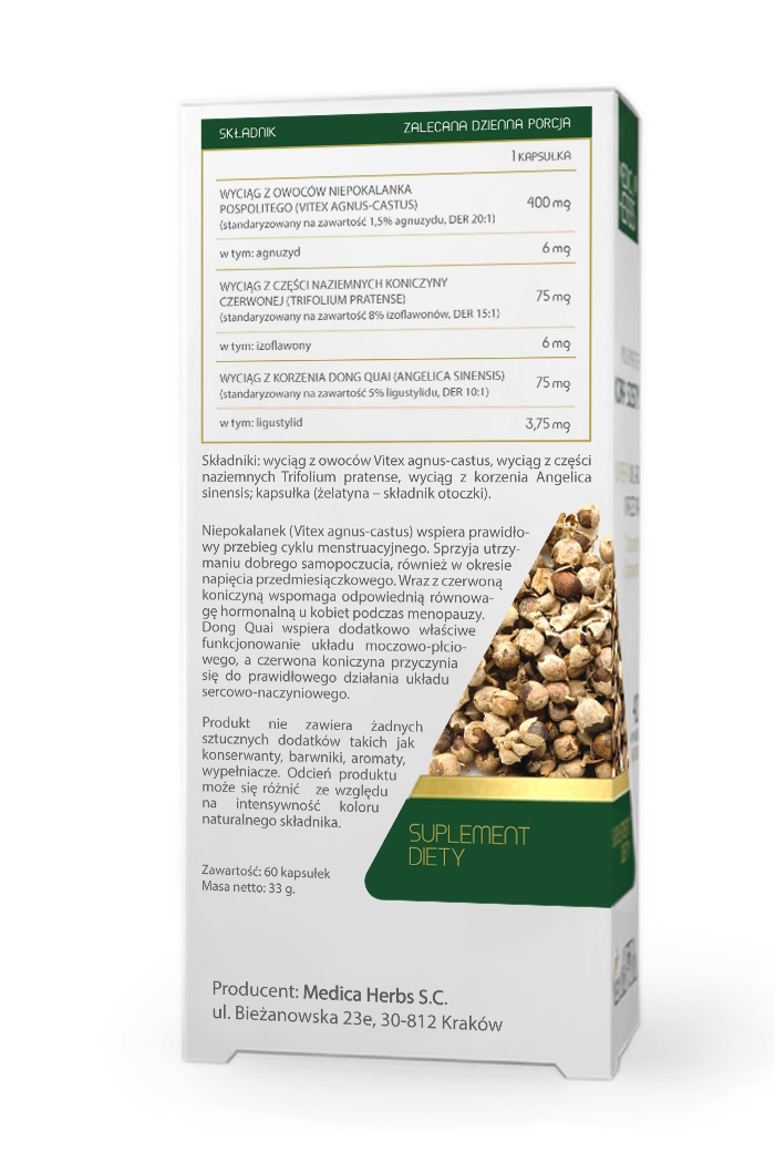 wyciąg z owoców Vitex agnus-castus, wyciąg z części naziemnych Trifolium pratense, wyciąg z korzenia Angelica sinensis; kapsułka (żelatyna – składnik otoczki).