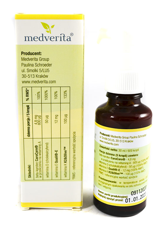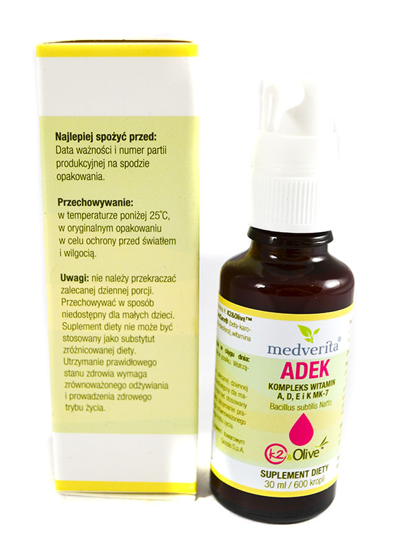 Najwyższej jakości preparat zawierający witaminy A, D, E oraz K MK-7 pochodzenia naturalnego, rozpuszczone w oliwie z oliwek.