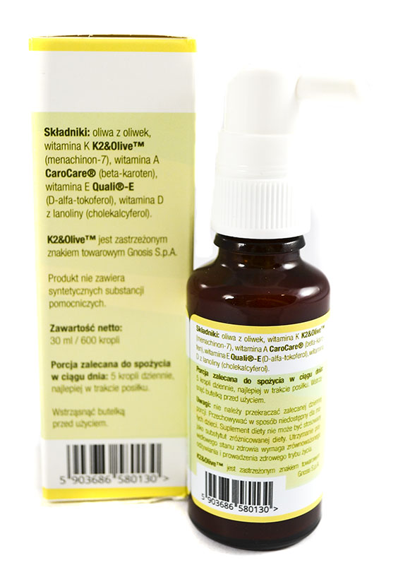 oliwa z oliwek, witamina K K2&Olive™ (menachinon-7), witamina A CaroCare® (beta-karoten), witamina E Quali®-E (D-alfa-tokoferol), witamina D z lanoliny (cholekalcyferol).