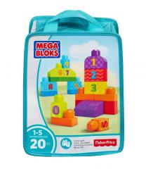 Zestaw kolorowych klocków z cyferkami zapakowany w ekologiczną (wolną od PVC), zapinaną na suwak torbę.