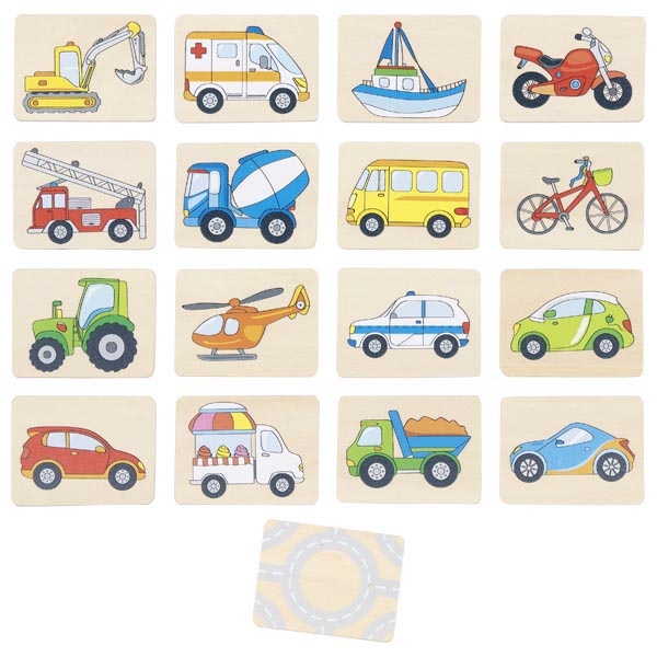 32 drewniane karty z wizerunkami różnych pojazdów. Idealne dla małych fanów motoryzacji, ćwiczą pamięć i refleks. Gra wspiera koordynację wzrokową oraz rozwija słownictwo, gdy dziecko nazywa poszczególne pojazdy. Karty układamy do dołu obrazkiem, następnie odkrywamy po dwa i gdy znajdziemy dwa takie same to zabieramy parę. Jeśli nie znajdziemy, odkładamy karty obrazkiem do dołu i kolej na ruch drugiego gracza. Zadanie polega na znalezieniu dwóch takich samych kart. To gra znana pod nazwą memo lub memory.