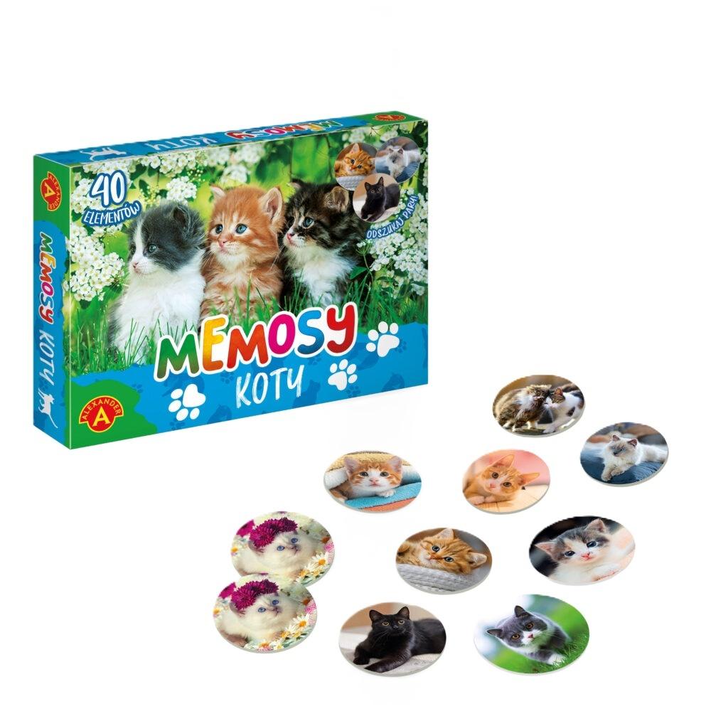 Memosy Koty to gra w której wygrywa ten, kto najlepiej zapamięta położenie par tych samych obrazków. Tabliczki rozkładamy na stole rewersem do góry, a potem odkrywamy na chwilę jedna po drugiej i próbujemy z pamięci wskazać miejsce pasującego obrazka. Gra jest skierowana jednocześnie do dzieci i dorosłych. To świetny trening pamięci i spostrzegawczości. Zapewnia dużo dobrej zabawy i emocji w otoczeniu przepięknych zdjęć kotów.