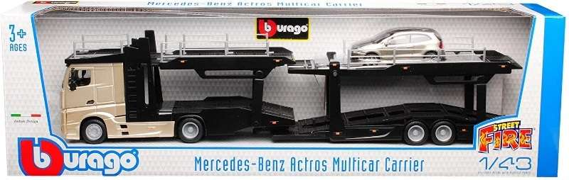Metalowy model pojazdu BBURAGO LAWETA MERCEDES-BENZ ACTROS W VW Polo GTI MARK 5 w skali 1:43. Zabawka w kolorze złoto-szarym przeznaczona dla dzieci od 3. roku życia.