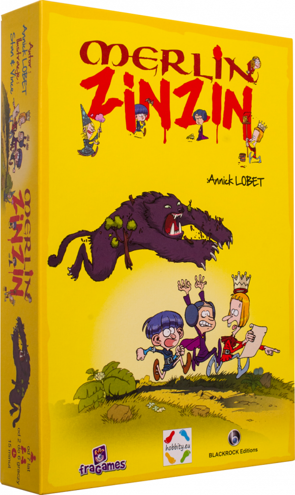Po tym jak czarodziej Merlin skradł magiczną księgę swemu ojcu, został porwany przez czarownicę Morfagę. Jego przyjaciołom: Vivianie, Lancelotowi, Arturowi i Ginewrze udało się go uwolnić, jednak nadal są w niebezpieczeństwie. Muszą jak najszybciej dotrzeć do miasteczka Broceliande i schronić się w nim przed potwornym kotem Morfagi, ktory ruszył za nimi w pościg... Merlin Zinzin (Annick Lobet) - kooperacyjna gra akcji dla 2-6 graczy od 7 lat. Wymaga od grających współpracy oraz koordynacji ruchowej. Gra nie powoduje konfliktów, ponieważ jeśli graczom uda się osiągnąć wspólny cel - wygrywają wszyscy. Doskonale sprawdza się w gronie rodzinnym oraz na przyjęciach urodzinowych i integracyjnych. Przed rozpoczęciem rozgrywki ustala się w grze poziom trudności, dzięki temu ukończenie gry może być wyzwaniem również dla dorosłych. Merlin ZinZin to gra planszowa na podstawie popularnej serii książek Marc'a Cantin'a pt. Merlin ZinZin z ilustracjami Stan & Vince. Gra silnie nawiązuje do tradycji i stylistyki francuskiego komiksu. Natomiast konsultacje mechaniki przeprowadzał znany francuski autor gier Roberto Fraga. Gra zdobyła główną nagrodę na Festiwalu Gier w Parthenay (2012r.) oraz została nominowana do prestiżowej nagrody As d'Or 2013 (Gra Roku) we Francji. Zawartość: 1 duża plansza do gry, 1 plansza czarów, 56 dwustronnych pionków postaci, 1 kostka, 1 klepsydra z kotem, 3 żetony czarów, 16 okrągłych kart efektów, Czas gry: 15 minut.