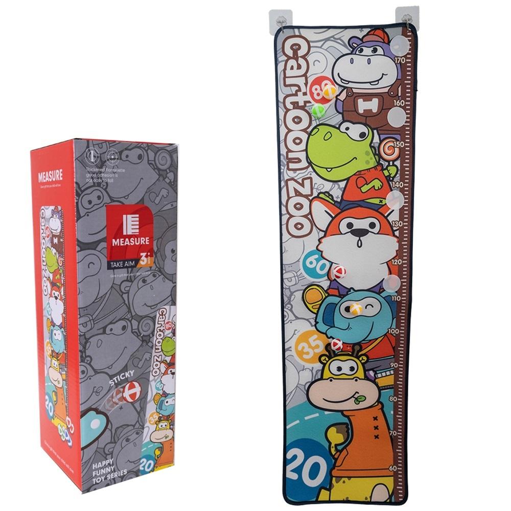 Miarka wzrostu, pakowana w kolorowe pudełko W zestawie: mata o wymiarach 35.5 x 127 cm; 6 piłeczek z rzepami, 6 naklejek + 4 rzepy do oznaczania wzrostu; 2 haczyki do powieszenia miarki Wymiary opakowania: 12.2 x 12.2 x 36.5 cm