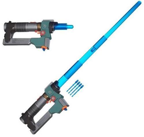 Dołącz do Rebelii, bądź jak Ezra! Walcz z ciemną stroną mocy przy pomocy nowego miecza świetlnego swojego ulubionego bohatera. Miecz głównego bohatera serialu Star Wars Rebelianci jest absolutnie wyjątkowy dzięki połączeniu wyrzutni z mieczem świetlnym. Samo ostrze ma prawie 0,5 metra długości i świeci oraz wydaje dźwięki. Do broni w trybie wyrzutni dołączonych jest aż 6 strzałek, które można ukryć w specjalnym magazynku.