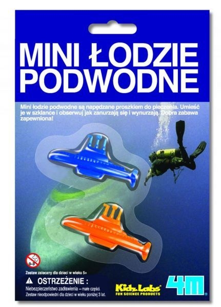Obserwuj jak łódzie podwodne zanurzają się i wypływają na powierzchnię z pomocą... proszu do pieczenia. Niesamowite! Otwórz górne pokrywy łodzi podwodnych i wypełnij je proszkiem do pieczenia. Zanurz łodzie w wodzie i potrząśnij nimi kilka razy pod wodą. Wypuść je z rąk, patrz jak wielkrotnie zanurzają się i wypływają na powierzchnię! Ponownie wypełniaj komorę i baw się do woli. Jak to działa? Łódź podwodna zanurza się naturalnie, gdyż jest cięższa od wody. Jednak, kiedy woda wchodzi w kontakt z proszkiem do pieczenia, zostaje uwolniony dwutlenek węgla, co powoduje wynurzenie się łodzi na powierzchnię. Gdy zostanie uwolniony cały dwutelenek węgla z jednej reakcji (zobaczysz pęcherzyki wydobywające się z łodzi), łódź zanurzy się ponownie. ZAWARTOŚĆ: 2 mini łodzie podwodne w kolorze niebieskim i pomarańczowym.