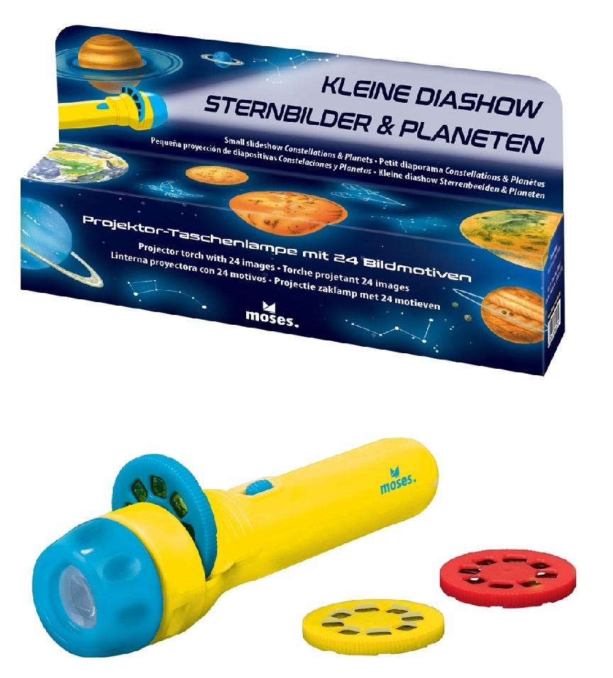 Latarka, Mini Projektor Gwiazd i Planet, Kosmos. Wspaniały prezent dla fanów Kosmosu, niezwykły pokaz planet i gwiazd Układu Słonecznego, który możesz przenieść do pokoju dziecinnego za pomocą latarki - projektora. W tym celu należy włączyć latarkę, wsunąć kółeczko z przeźroczami w szczelinę powstałą po odciągnięciu ruchomej części i skierować na ścianę w zaciemnionym pokoju. Niezwykły pokaz. Wyświetla 24 obrazy (3 kółeczka z przeźroczami). 8 Planet i 16 Konstelacji Układu Słonecznego. Idealna widoczność. Przeznaczony dla dzieci