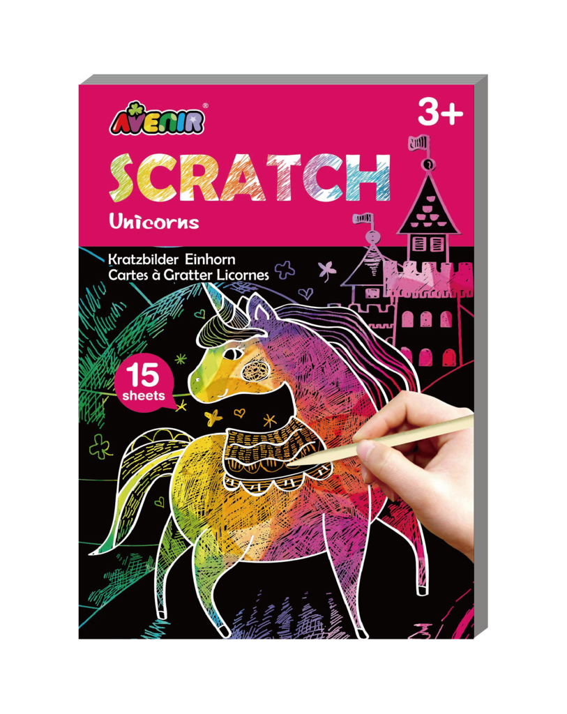 Mini książeczka z wydrapywankami to ciekawa propozycja dla kreatywnych dzieci. Prosta technika wydrapywania pozwala na stworzenie przepięknych oryginalnych obrazków przy niewielkim nakładzie pracy. Poręczny format książeczki doskonale sprawdza się, gdy dzieci są w ruchu. Zestaw zawiera: 10 kolorowanek z jednorożcami, 5 ""pustych"" czarnych stron na dowolne rysunki, rysik. Zapewnia mnóstwo zabawy dla dzieci. Wiek: 3+.