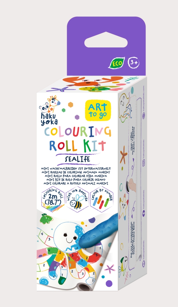 Mini zestaw do kolorowania zawiera kolorowankę w rolce o rozmiarze 2m, 4 kredki w kształcie fasolek oraz 20 naklejek. Eko kredki wykonane są z 10% wosku pszczelego, a ich opakowania wykonane są z papieru FSC. Nie pozostawiają plam."