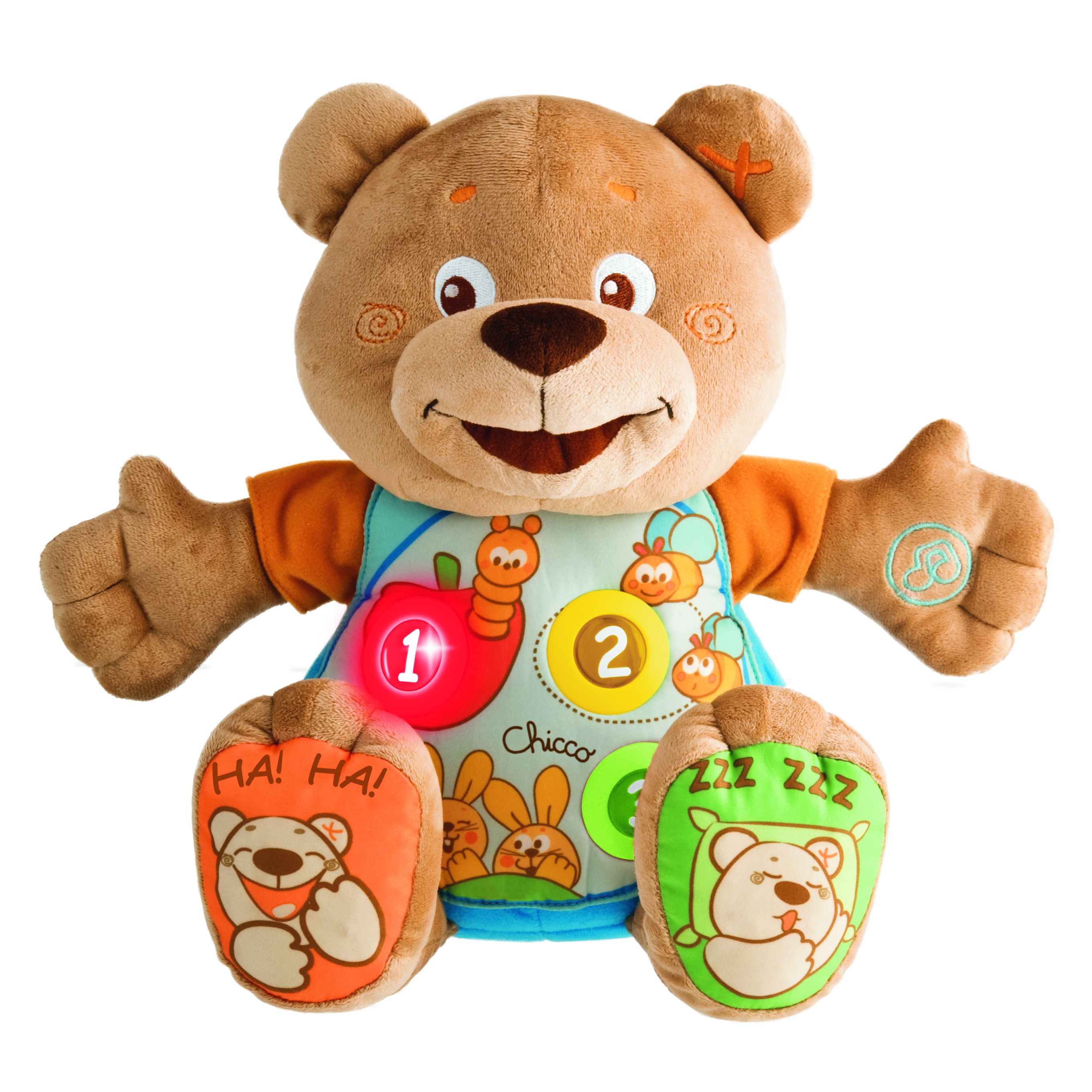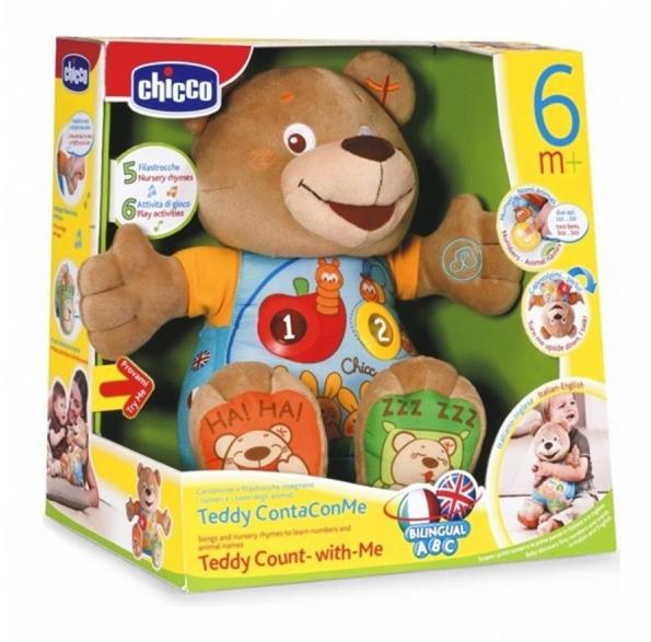 Miś licz ze mną jest idealną zabawką dwujęzyczną, która pomoże przyswoić dziecku słowa i cyfry w jego języku ojczystym, a także w języku obcym. Naciśnięcie przycisku na brzuszku misia, uaktywnia radosne rymowanki, co zachęca dziecko do wspólnych zabaw, liczenia i odkrywa nazwy owoców i zwierząt. Naciskając rękę i nogi misia, dziecko jest stymulowane do interakcji ze swoim nowym towarzyszem zabaw. Misio przewrócony do góry nogami komentuje swoje samopoczucie.