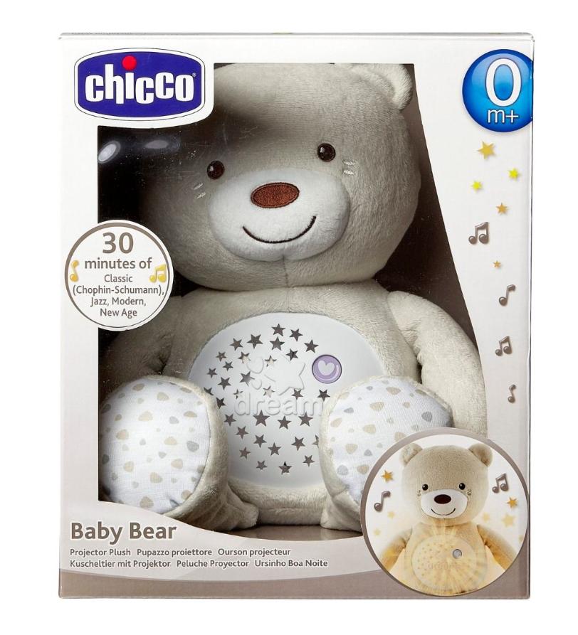 Miękki, delikatny i miły w dotyku pluszak z ukrytym w brzuszku mechanizmem, dzięki któremu czas, który dziecko spędza z maskotką, upływa przy akompaniamencie przyjemnej muzyki i efektów świetlnych. Przez brzuszek misia emitowane są efekty świetlne: intensywna, rozgwieżdżona poświata, delikatny blask, wewnętrzne światełko, idealne jako nocna lampka. Dźwięki, których maluch słucha nieprzerwanie przez 30 minut, to muzyka klasyczna (Bach i Beethoven), muzyka nowoczesna, soft rock, jazz oraz dźwięki natury.