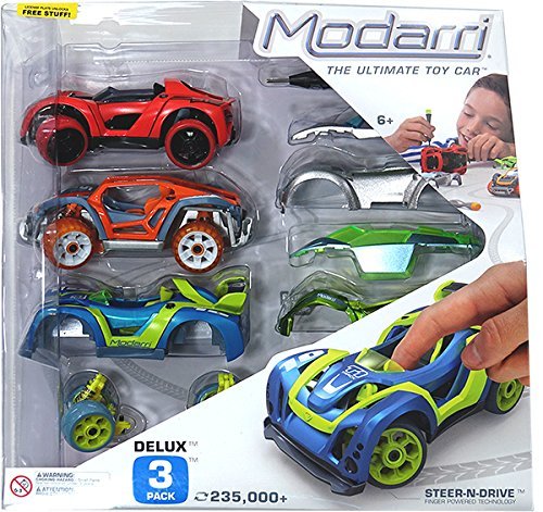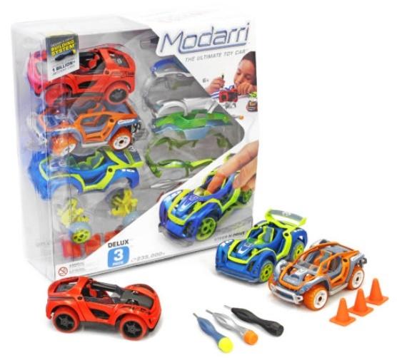 3-Pak Modarri Delux zawiera 3 unikalne dla tego zestawu samochody Delux (w kolorach niedostępnych poza 3-pakiem Delux), 3 śrubokręty oraz 8 pachołków drogowych.