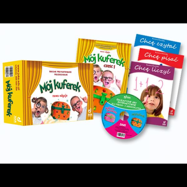 Mój kuferek to zestaw edukacyjny przeznaczonego zarówno dla dzieci uczęszczających do przedszkola jak i tych, które już rozpoczęły swoją szkolną przygodę w oddziałach zerowych.Pakiet przygotowuje dzieci do rozpoczęcia nauki w klasie pierwszej i zapewnia przyjemną naukę poprzez zabawę, a także w przyjazny sposób zapoznaje dziecko ze światem cyfr i liter.Ponadto Mój kuferek zawiera szeroki wachlarz wyjątkowych propozycji działań plastycznych, muzycznych oraz ćwiczeń wspierających rozwój intelektualny i emocjonalny.W zestawie rozszerzonym znajdują się trzy dodatkowe publikacje dla dziecka: Chcę pisać, Chcę czytać, Chcę liczyćSkład pakietu: Karty pracy część 1, 2, 3, 4, 5 Materiały uzupełniające Abecadło Prace plastyczne - NOWOŚĆ Gry interaktywne dla pięcio- i sześciolatka (CD-ROM) Liczydło - NOWOŚĆ Ołówek ergonomiczny - NOWOŚĆ Chcę pisać. Karty pracy Chcę czytać. Karty pracy Chcę liczyć. Karty pracy
